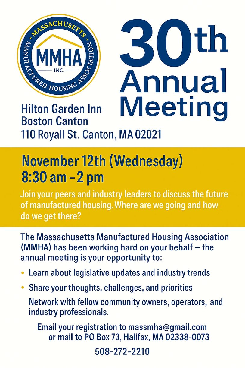 The Massachusetts Manufactured Housing Association, Inc. (MMHA) is a statewide not-for-profit organization established in 1996 representing manufactured housing community owners/operators, manufacturers, insurers, financiers, and suppliers throughout the Commonwealth of Massachusetts.